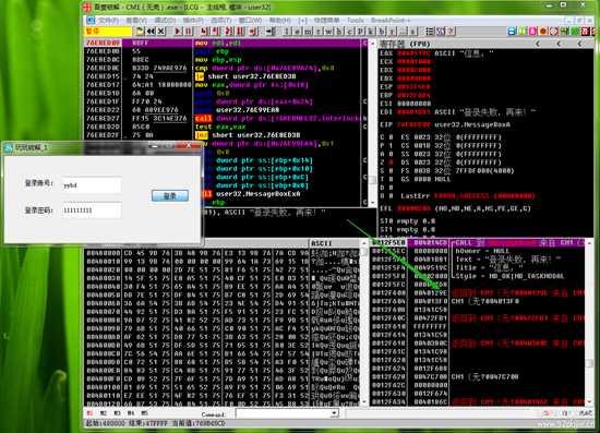 因为这个软件点登陆后,如果账号和密码不对,会提示“登录失败,再来”,你可以搜索字符串,也可以用弹出信息框的命令MessageBoxA来下断点,当你输入账号密码,点登陆,等程序断下来后,你看右下角的堆栈区,用刚才我们讲的知识来看看,第一行是CALL到MessageBoxA,意思是马上要执行的就是弹出对话框,再看绿色箭头指的“返回到”,最下面的是最早执行的CALL,最上面的返回到是刚执行过的CALL,那么我们进行反查,就要先从最上方那个刚执行过的CALL来进行。我们怎么做呢?就是在第一个返回到那一行点鼠标右键,在提示菜单里选择“反汇编窗口跟随”,就会出现下面的图示: