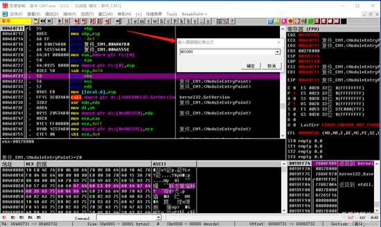 第四个区是寄存器区,里面会显示寄存器,你看的EAX,ECX,EBX,EDX等八个首字母是E的都叫做寄存器。寄存器的作用和程序的其他内存地址一样,都是用来存放数据的,区别就是寄存器在CPU里面,读取数据的速度比从内存地址里要快,所以我们程序里面的很多运算都是把数据从内存地址里面复制到寄存器里面,然后进行运算,运算结束后,再把运算结果复制到内存地址里面,寄存器就等待着下一次的运算任务。所以你会在程序的汇编代码区看到有很多的数据转移命令,比如MOV ,PUSH等等。其实在汇编代码里面把这些数据转移和数据计算的代码去掉,剩下的代码就很有限了,主要剩的就是跳转指令、判断指令和CALL了,到现在你还看不懂汇编代码吗?另外,在这些寄存器里面,我们特别需要关注的就是EAX,我们以前说过,所有子程序也就是CALL的返回值都存放在EAX里面。
